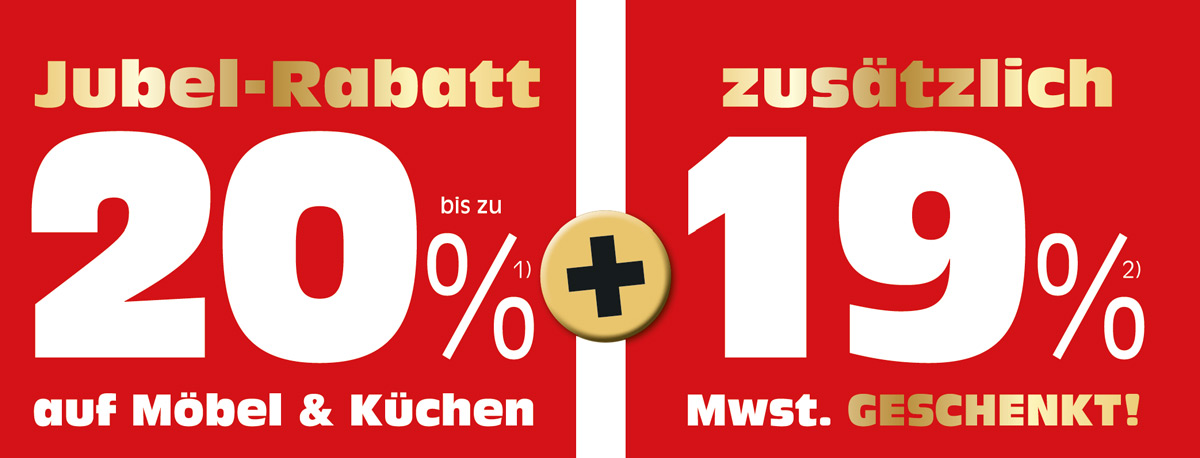 *Zusätzlich 19% Rabatt: Unglaublich: Auf unsere schon supergünstigen Preise gewähren wir Ihnen nur für kurze Zeit einen Rabatt in Höhe des Mehrwertsteueranteils! Allerdings können wir aus gesetzlichen Gründen nicht die Mehrwertsteuer als solche erlassen. Der Kassenbon wird daher weiterhin eine Mehrwertsteuer ausweisen, jedoch bezieht sich diese auf einen entsprechend reduzierten Betrag. Der Kunde ist nicht berechtigt, die Erstattung des auf dem Kassenbon ausgewiesenen Mehrwertsteueranteils zu verlangen. 19% MwSt. = Verkaufspreis abzüglich 15,97%. Bei 50% Anzahlung inkl. Lieferung. Nicht mit anderen Vorteilsaktionen kombinierbar. Nicht in bar auszahlbar Bis zu 40% = 20% Sofortrabatt + 10% Extrarabatt (bestehend aus 5% Skonto bei voller Vorauskasse + 5% bei Selbstabholung) + 10% Messerabatt. Gilt auf alle Neukäufe bei Möbeln.  Hicht bei schon bestehenden Aufträgen, preisreduzierter, besonders gekennzeichneter Werbeware in unserer Ausstellung, Zubehör, Ersatzteilen, Nähservice, Einkaufsgutscheinen, Elektrokleingeräten sowie Serviceleistungen, Sonderbestellungen, Dienstleistungen, Tempur, Sensoflex, Hasena, Team7, Birkenstock, Röwa, Leonardo living, Rolf Benz, Jensen, Ruf Betten, Interliving, Kare, desigual, Roomio, Gutmann, iRest Germany, 18Hundert und Stressless®.