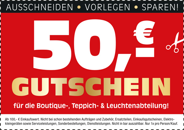 Zum Öffnen bitte anklicken. Ab 100,- € Einkaufswert. Nicht bei schon bestehenden Aufträgen und Zubehör, Ersatzteilen, Einkaufsgutscheinen, Elektrokleingeräten sowie Serviceleistungen, Sonderbestellungen, Dienstleistungen. Nicht in bar auszahlbar. Nur 1x pro Person/Kauf.