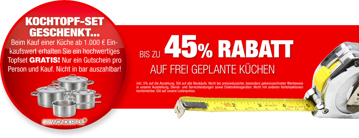 *Bis zu 45% Rabatt auf freigeplante Küchen: inkl. 5% auf die Anzahlung. Gilt auf alle Neukäufe. Nicht bei preisreduzierter, besonders gekennzeichneter Werbeware in unserer Ausstellung, Dienst- und Serviceleistungen sowie Elektrokleingeräten. Nicht mit anderen Vorteilsaktionen kombinierbar. Gilt auf unsere Listenpreise.